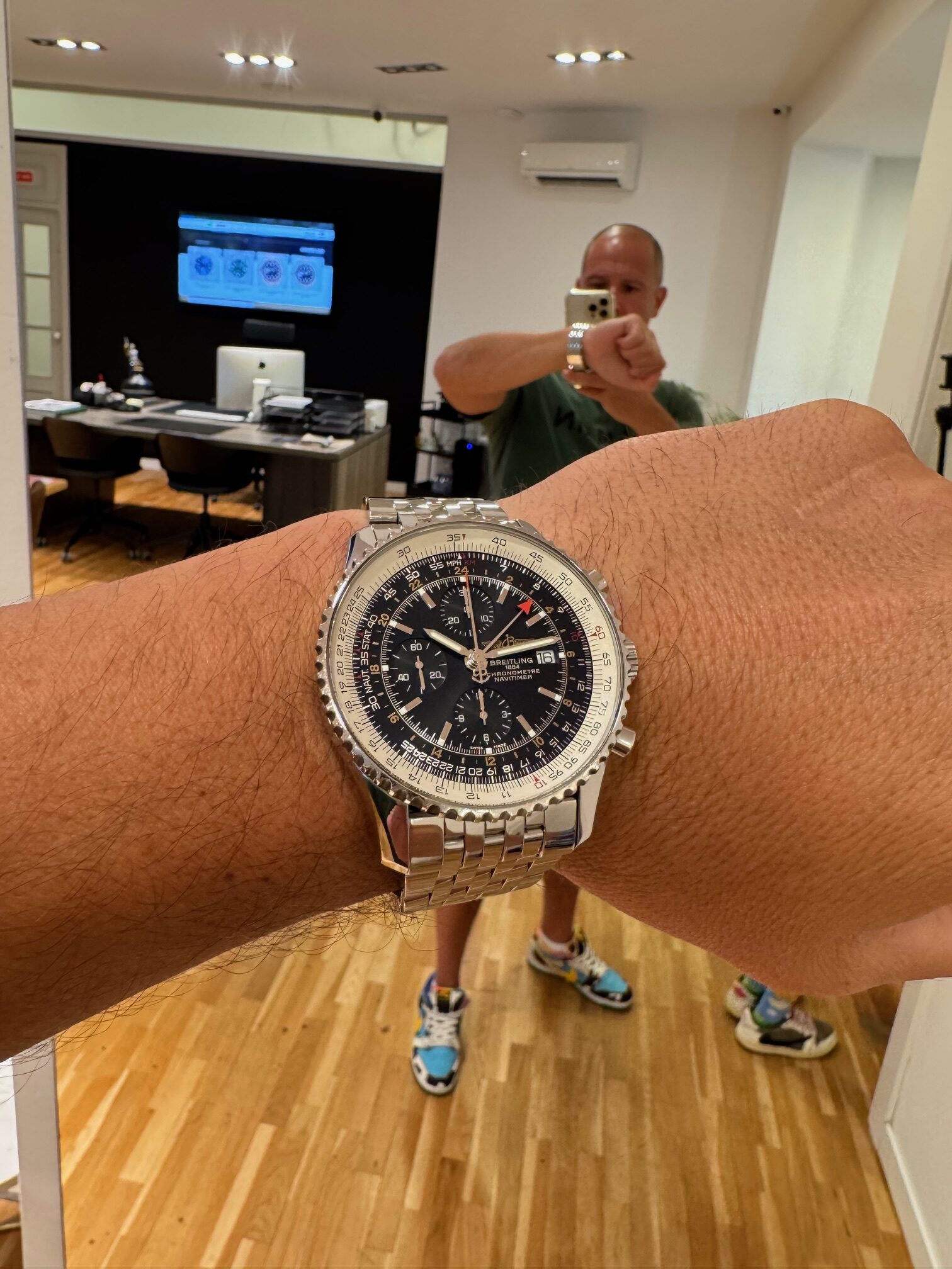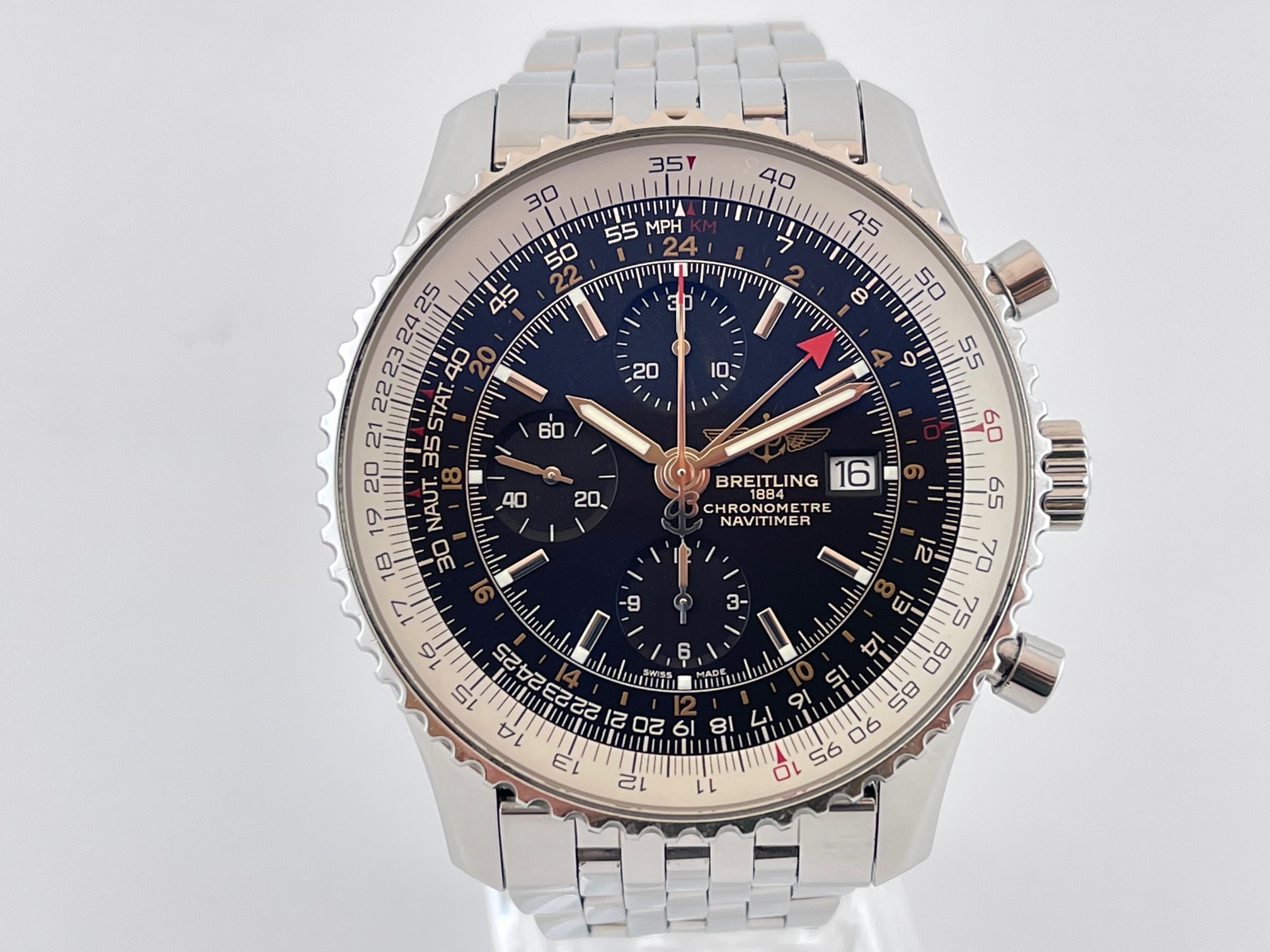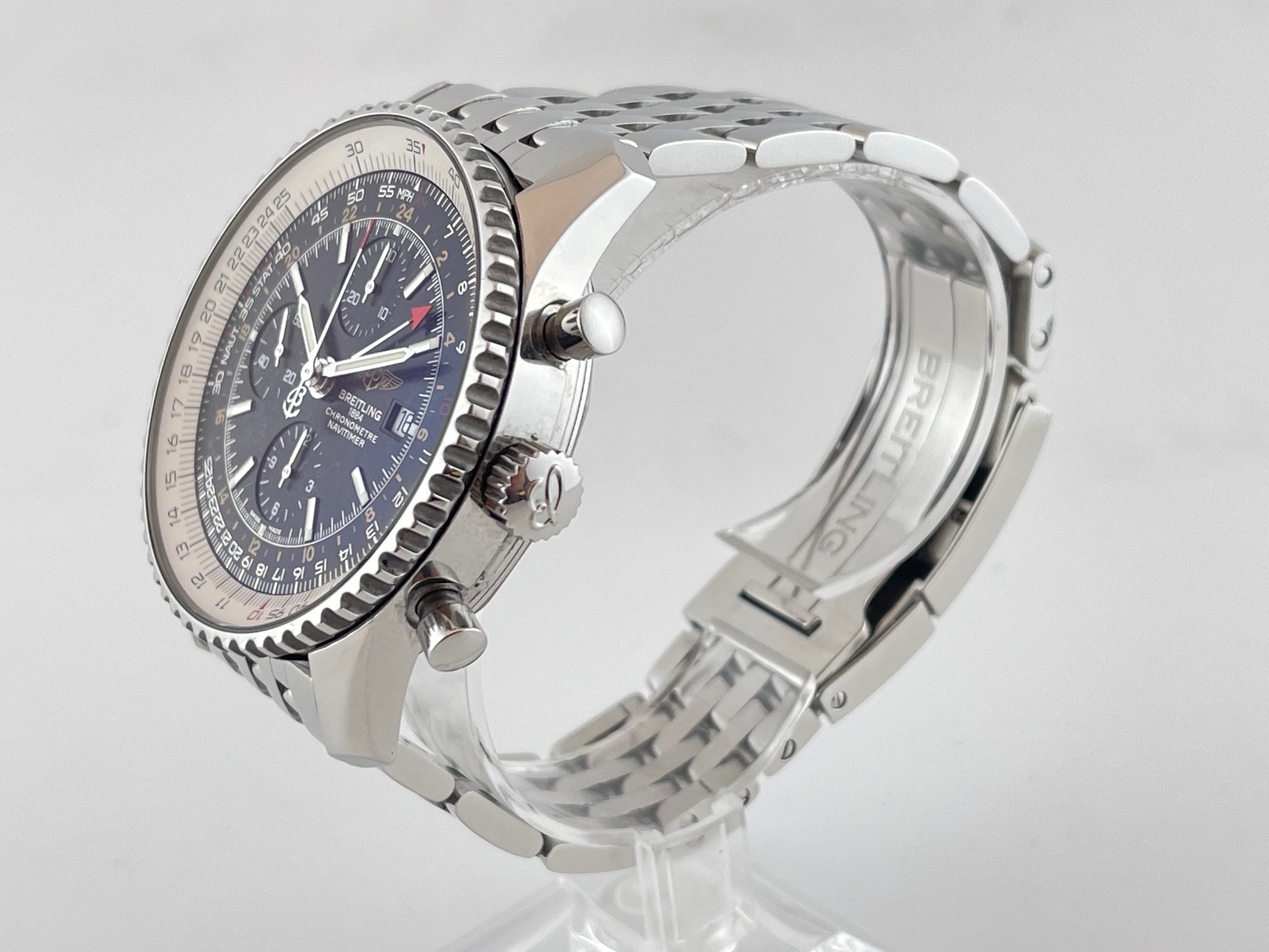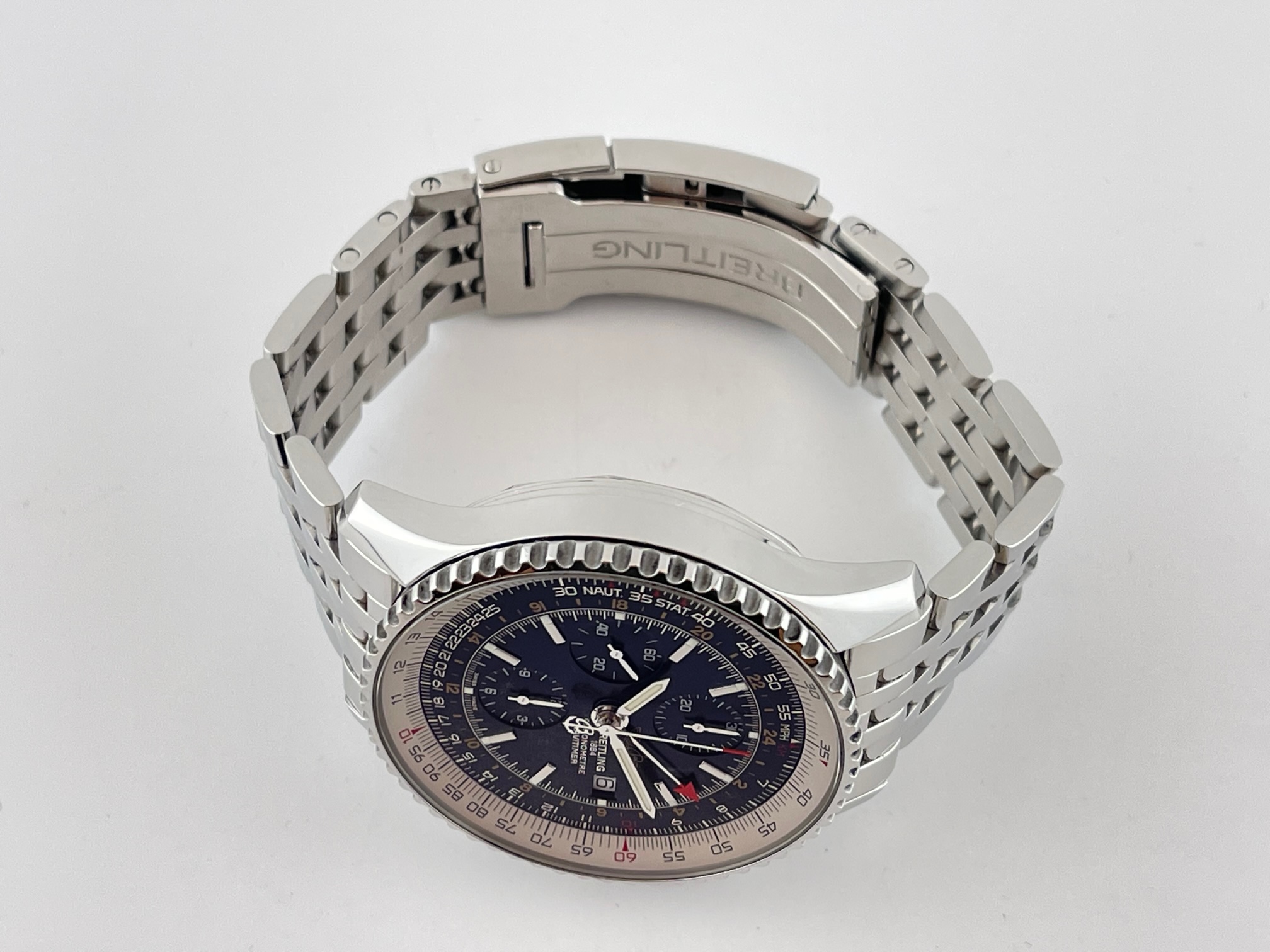 Breitling Navitimer World Gmt A24322. Horloge is in topstaat, van 2018, en helemaal compleet met doos en papieren.