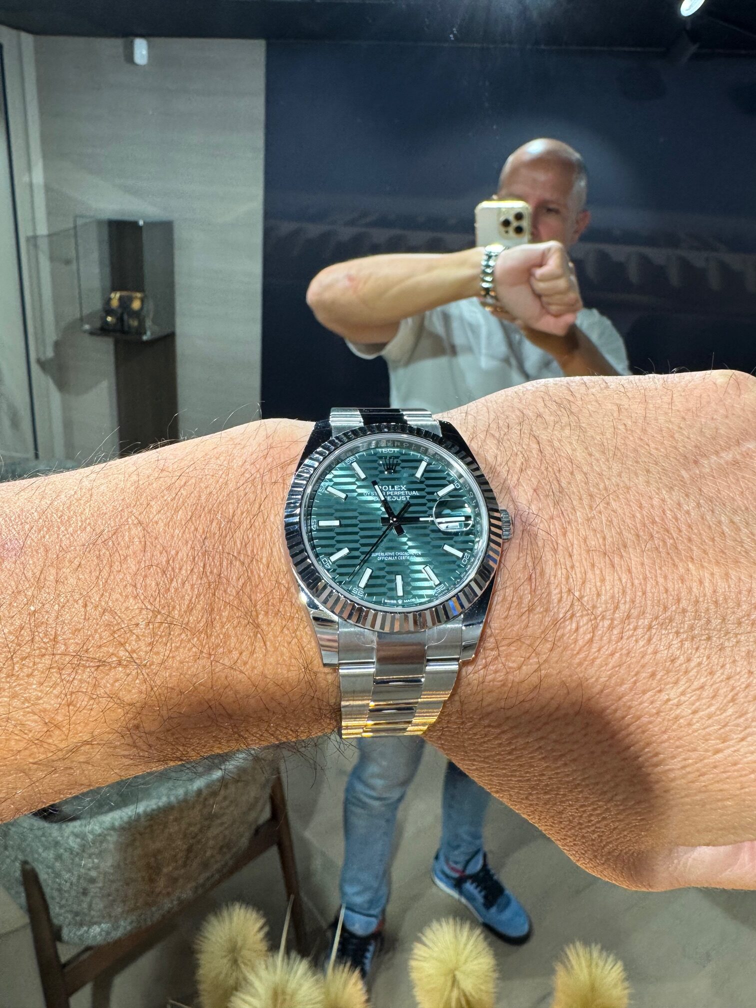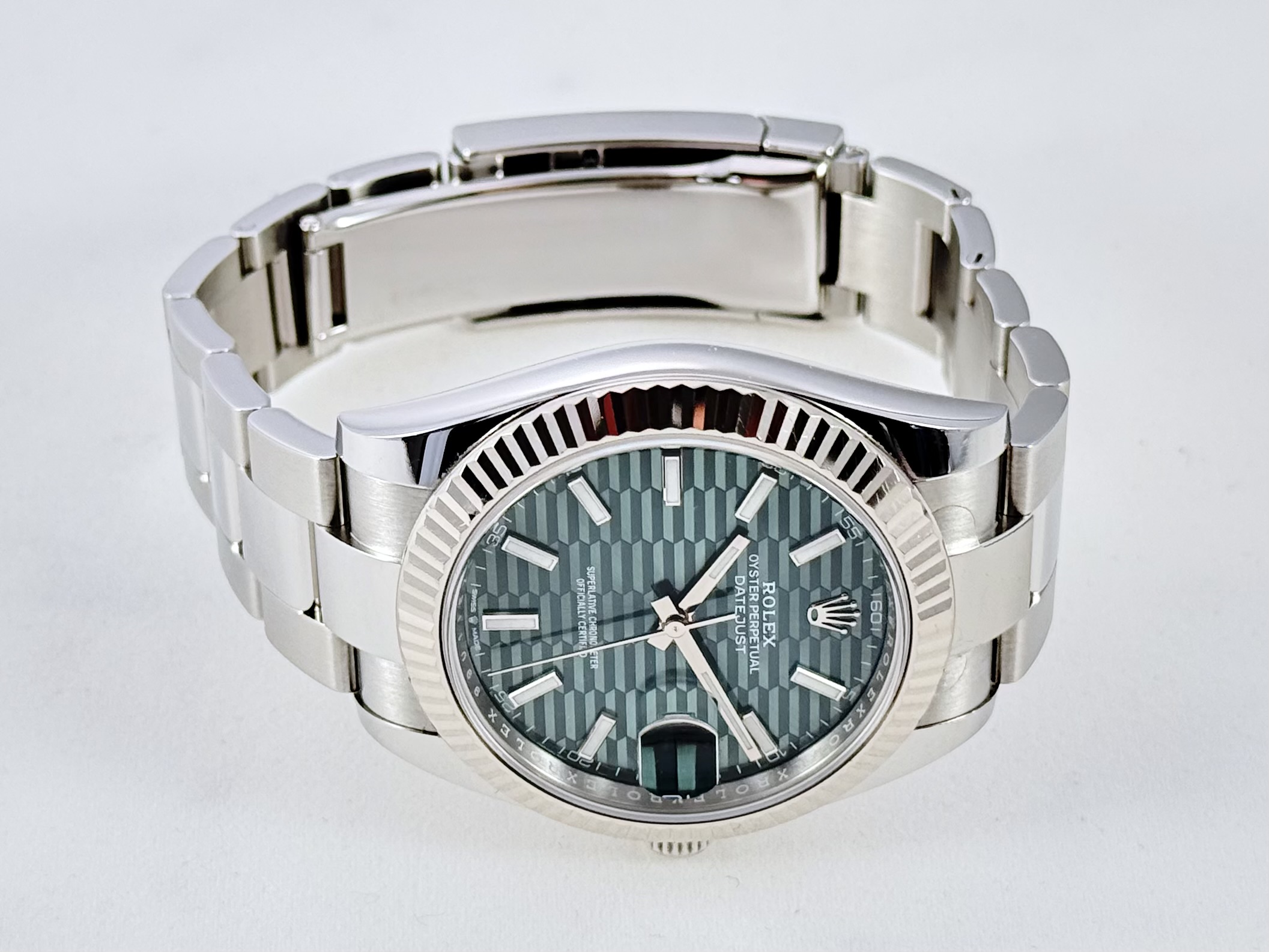 Rolex Datejust 41 126334 Green Motif dial. Horloge is splinternieuw, van 05/2023, en helemaal compleet met doos en papieren.